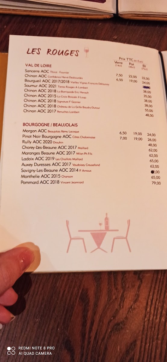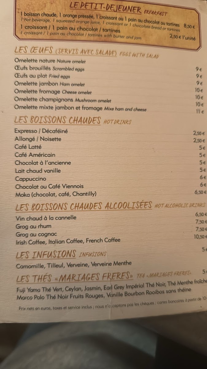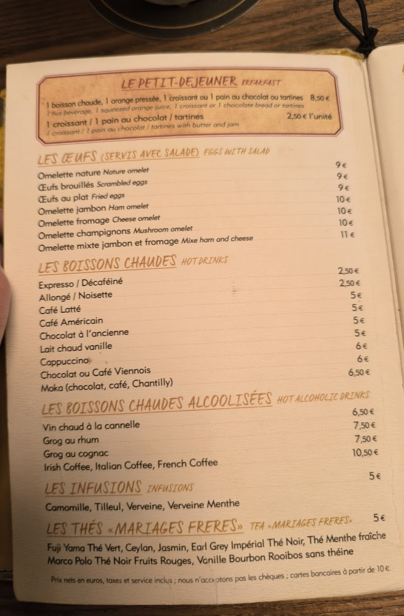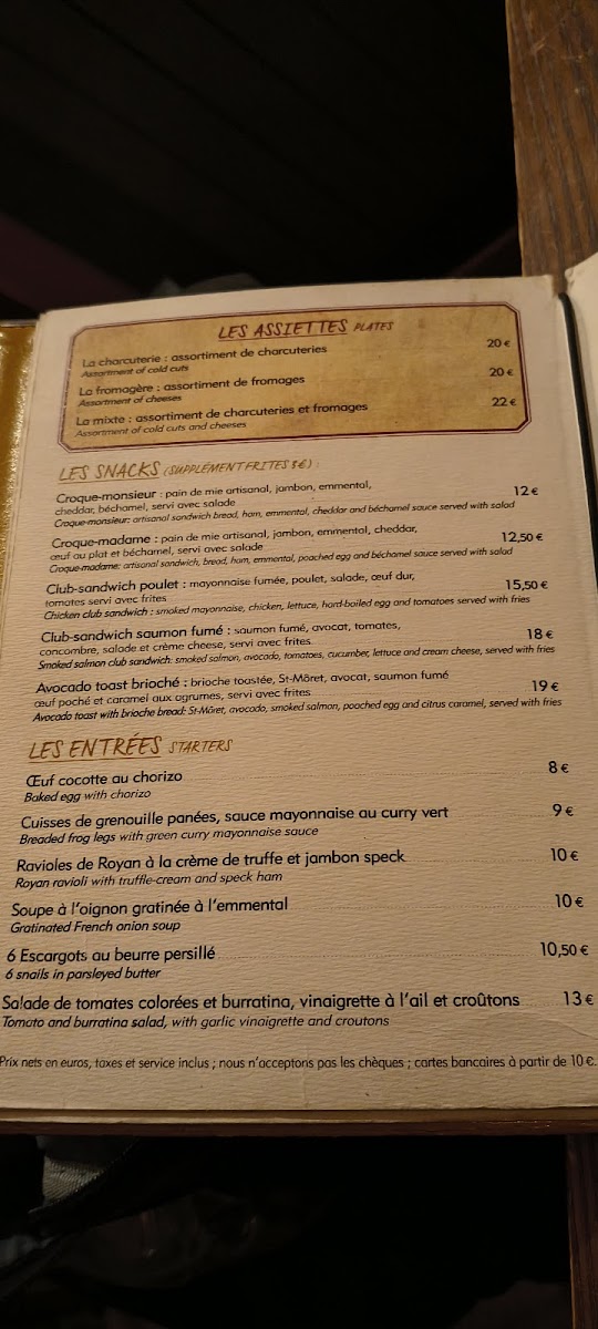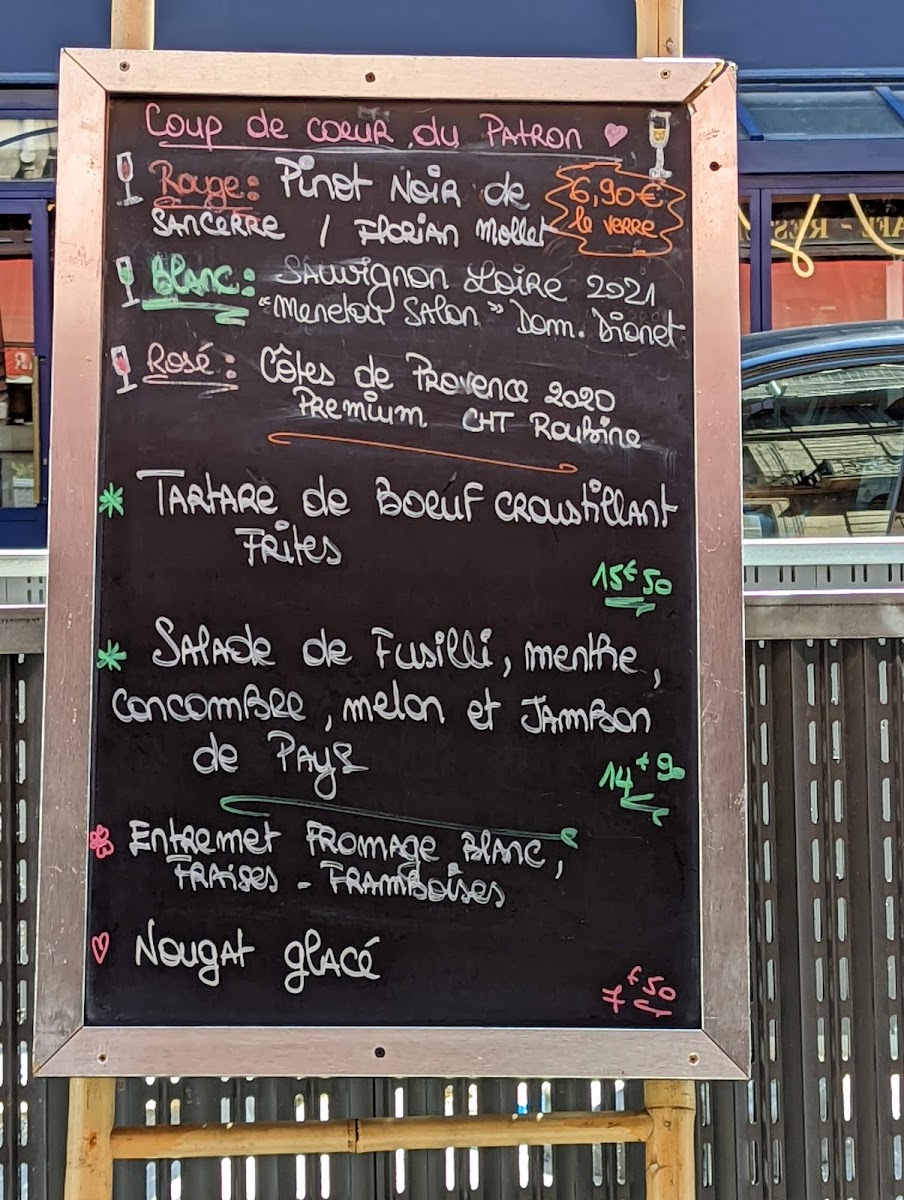 The menu also features traditional French touches, including escargot, onion soup, and tartare de boeuf, which blend seamlessly with lighter fare like salads and antipasti. These choices pair well with the inviting atmosphere—whether you’re enjoying a quiet meal inside or a quick coffee and chocolat chaud to warm up on a cool afternoon.